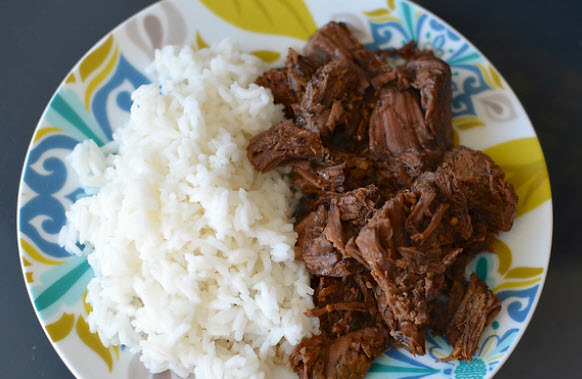 Succulent roast beef, seasoned to perfection, served alongside a generous portion of savory rice.