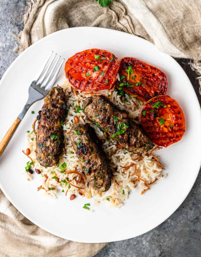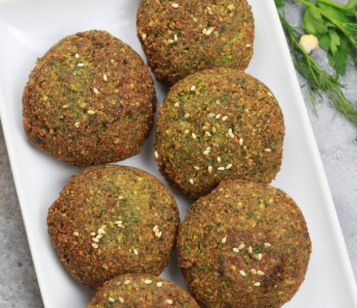 homemade falafel with tomato, lettuce, onion, tabouli & hummus