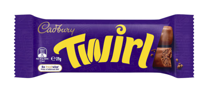 Two bars of swirls and curls coated in Cadbury dairy milk milk chocolate
